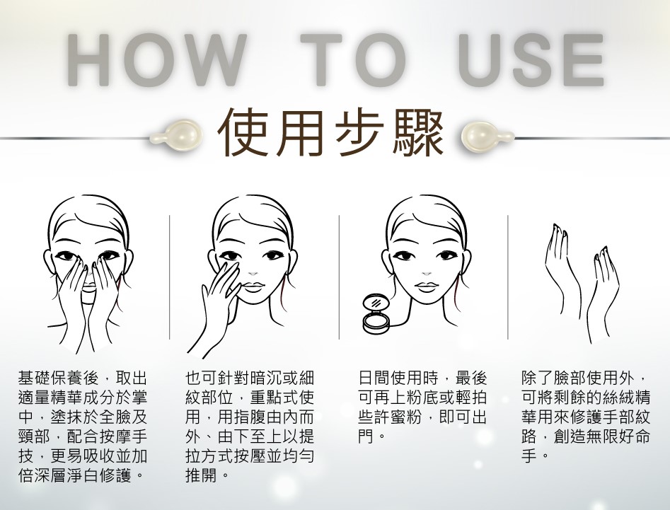基礎保養後,取出膠囊將尾端轉開或剪開,倒出適量精華成分於掌心,塗抹於全臉及頸部,充分按摩至吸收即可。亦可針對局部位置重點式使用,用指腹由內而外、由下至上以提拉方式按壓並均勻推開;日間使用時,最後可再上粉底或輕拍些許蜜粉,即可出門。